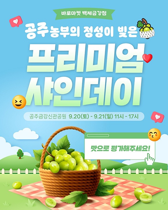 [아이뉴스24 박준표 기자] 충남 공주 지역 포도 농가들이 오는 20일과 21일 이틀간 금강신관공원 내 바로마켓 백제금강점에서 ‘프리미엄 샤인데이’ 행사를 연다.