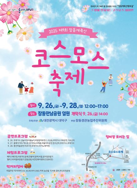 [아이뉴스24 강일 기자] 대전 대덕구가 오는 26일부터 28일까지 사흘간 장동만남공원에서 ‘제9회 장동계족산 코스모스축제’를 개최한다.