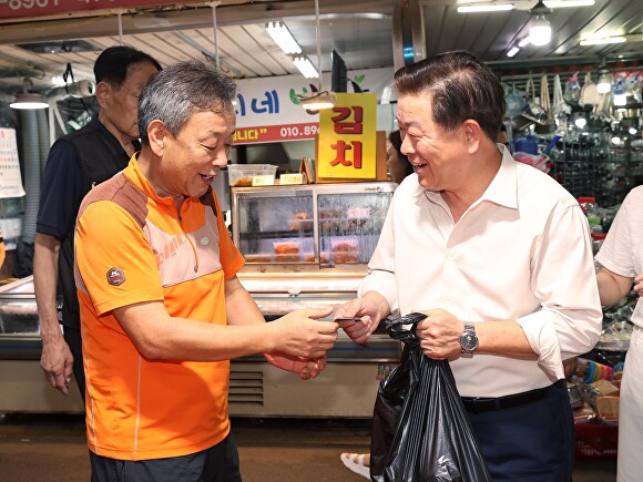 박승원 시장이 지난해 9월 추석 명절을 앞두고 새마을 전통시장을 찾아 광명사랑화폐로 상품을 구매하고 있다. [사진=광명시]