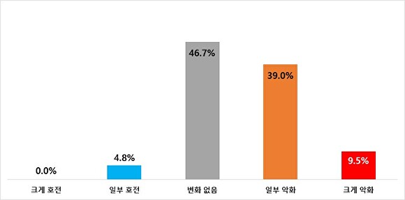 전반적 경기 상황에 대해서는 “악화됐다”가 48.5%, “변화 없다” 46.7%, “호전됐다”는 4.8%로 집계됐다. 특히 제조업체를 대상으로 한 美관세 등 무역환경 불확실성 조사에서는 “불확실성이 증가했다”는 응답이 38.8%로 나타나 대외 리스크에 대한 불안감이 확인됐다.