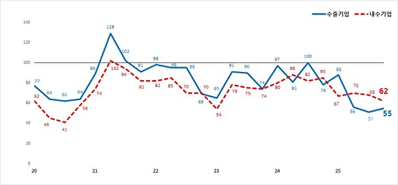 제조업을 수출기업과 내수기업으로 나눠보면 희비가 엇갈렸다. 수출기업의 4분기 BSI는 55로 전 분기보다 4포인트 상승했으나, 내수기업은 62로 6포인트 떨어졌다. 내수 부진이 장기화하는 가운데, 해외 판로를 가진 기업들이 상대적으로 선방한 것으로 풀이된다.