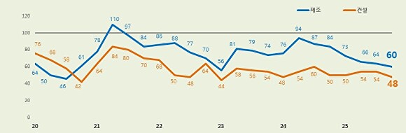 28일 발표된 대구상의(회장 박윤경)가 지역 제조업 160개사, 건설업 50개사 등 총 210개 기업을 대상으로 지난 9일부터 12일까지 조사한 결과, 4분기 제조업 BSI는 60, 건설업은 48로 집계됐다. 지난 분기 대비 제조업은 4포인트, 건설업은 6포인트 하락했고 이는 2021년 2분기 이후 18분기 연속 기준치(100)를 밑도는 수치다.