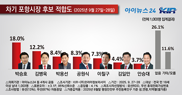 이어 김병욱 전 국회의원(포항남·울릉) 12.2%, 박용선 경북도의원 8.4%, 공원식 전 경상북도 정무부지사 8.3%, 이칠구 경북도의원 7.3%, 김일만 포항시의회 의장 4.4%, 안승대 울산시 행정부시장 3.7%로 조사됐다. 적합인물없음(26.1%), 이외후보·모름(11.6%) 등 부동층 규모가 37.7%로 나타나 향후 이들의 여론 추이가 주목된다.