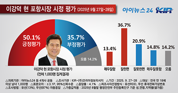 현 이강덕 포항시장의 재임 기간 시정 운영 평가는 긍정평가 50.1%, 부정평가 35.7%로 나타났다.
