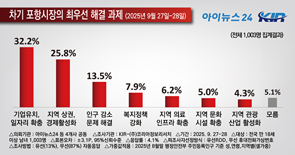 차기 포항시장이 우선적으로 해결해야할 당면 과제는 △기업유치‧일자리 확충이 32.2%로 가장 높았고, △지역상권 및 경제활성화(25.8%) △인구감소문제해결(13.5%) △복지정책강화(7.9%) △지역의료인프라확충(6.2%) △지역문화시설확충(5.0%) △지역관광산업활성화(4.3%) 등이 뒤를 이었다.
