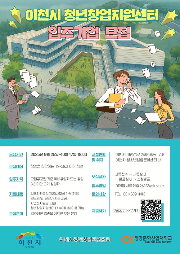 자세한 사항은 청강문화산업대학교 산학협력단 누리집(https://www.ck.ac.kr) 또는 산학협력단 청년창업지원센터팀(☎031-639-4413)으로 문의하면 된다.