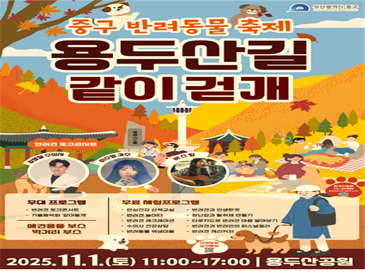 [아이뉴스24 정예진 기자] 부산광역시 중구가 오는 11월 1일 용두산공원 일원에서 첫 반려동물 축제 ‘용두산길 같이걷개’를 개최한다.