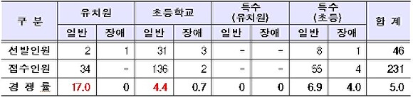 [아이뉴스24 강일 기자] 대전시교육청은 2026학년도 대전시 공립 유치원․초등학교․특수학교(유치원․초등)교사 임용후보자 선정경쟁시험」원서접수 결과 총 46명 선발에 231명이 접수해, 평균 5대1의 경쟁률을 보였다고 밝혔다.