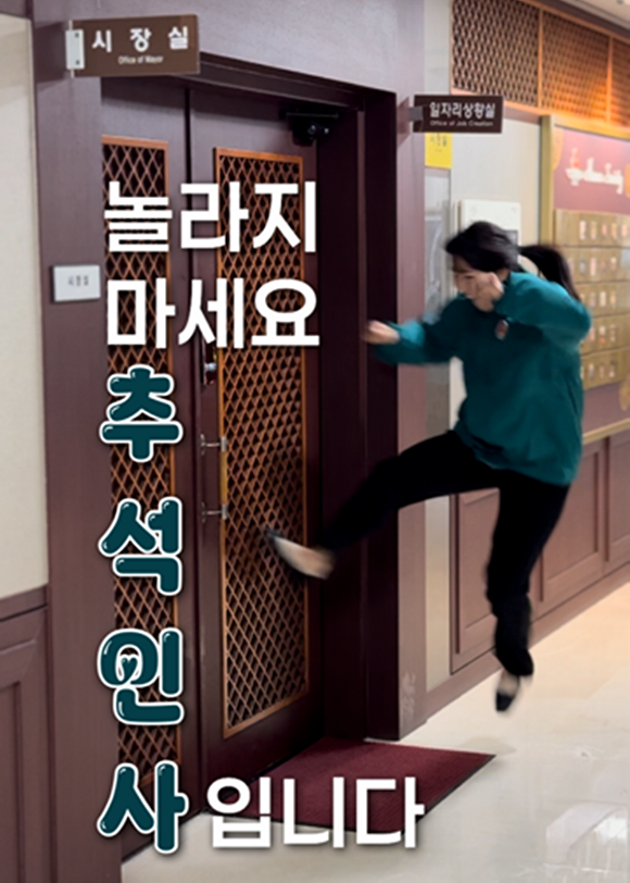 이어 공개된 '문 차는' 릴스는 직원들이 닫힌 줄 알았던 시장실 문을 발로 차고 지나가자, 문이 열리며 주낙영 시장이 추석 인사를 전하는 장면으로 구성돼 웃음을 자아냈다.