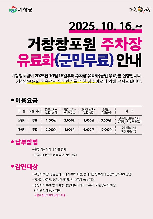 이번 조치는 '거창군 거창 창포원 지방 정원 관리 및 운영 조례'에 따른 것이다. 군은 거창군민을 제외한 외부 방문객 차량을 대상으로 주차 요금을 징수할 계획이다.