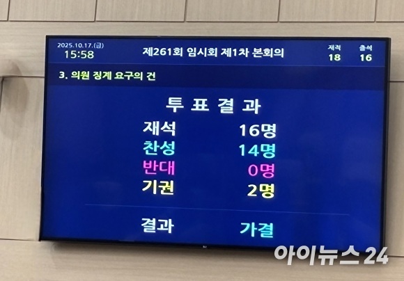이날무기명투표로 진행된 제명 찬반투표에서는 재적의원 18명, 출석의원 16명 중 14명이 찬성, 기권 2명으로 가결됐다. 반대 시의원은 단 1명도 없었다.