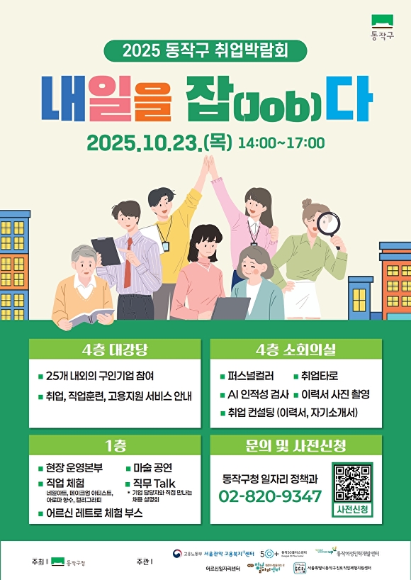[아이뉴스24 홍성효 기자] 동작구가 오는 23일 오후 2시 구청 신청사에서 2025 취업박람회 ‘내일을 잡(Job)다’를 개최한다고 17일 밝혔다.