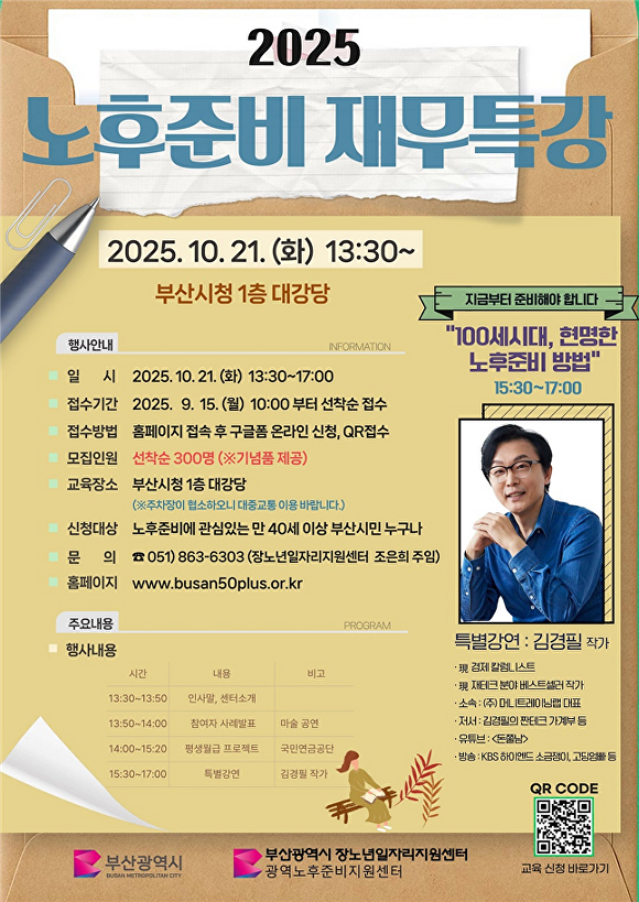 [아이뉴스24 정예진 기자] 부산광역시가 오는 21일 부산광역시청 대강당에서 ‘노후준비 재무특강’을 개최한다.