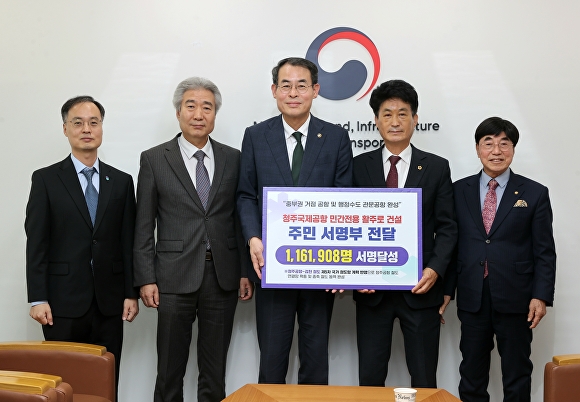 ‘청주공항 활성화 민‧관‧정 위원회’는 20일, 강희업 국토부 제2차관을 방문해 116만 명의 염원이 담긴 ‘청주공항 민간전용 활주로 건설’ 서명부를 전달했다.