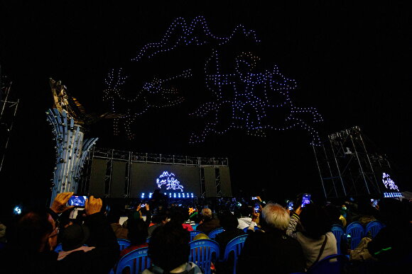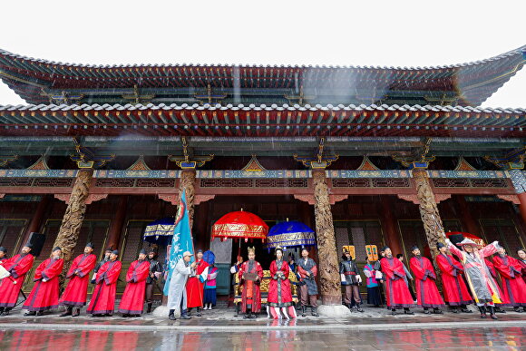 드라마 세트장처럼 꾸며진 황궁 앞 거리에는 관람객과 관계자가 나란히 도열하고 그 사이로 북소리를 울리며 군사와 군마 행렬이 지나가며 거대한 야외 연극장을 연출한다.