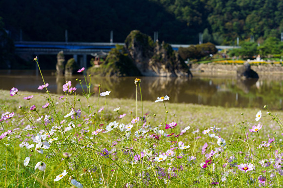 코스모스 7090㎡, 가우라베이비 4080㎡로 꾸며진 정원은 단양팔경의 으뜸인 도담삼봉을 배경으로 바람에 일렁이는 초화가 가을 햇살에 반짝이며 장관을 연출한다.