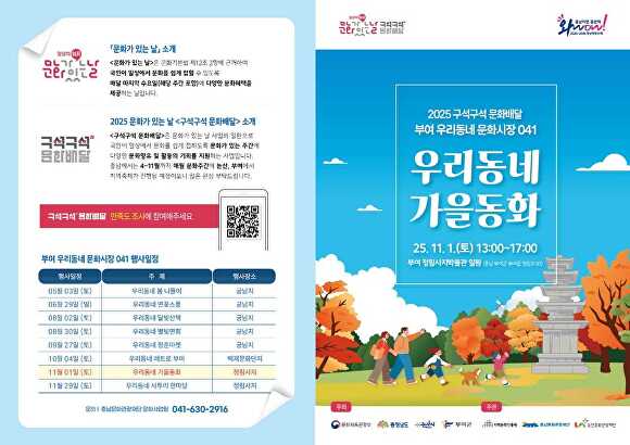 [아이뉴스24 정다운 기자] 충남 부여군은 오는 11월 1일 오후 1시부터 5시까지 정림사지 박물관 앞 광장에서 '2025 문화가 있는 날 구석구석 문화배달' 일곱 번째 이야기 우리동네 가을동화를 개최한다고 밝혔다.