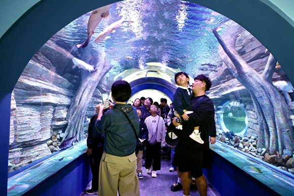 25일 문을 연 충주아쿠아리움에서 시민들이 물고기를 관람하고 있다. [사진=충주시]