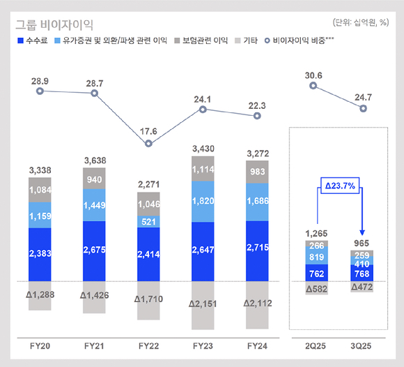 신한금융은 "3분기 당기순익은 기업대출 중심의 자산성장·수수료이익의 고른 증가, 효율적인 비용 관리 노력으로 시장의 기대에 부합하는 안정적인 실적을 냈다"면서도 "비이자이익은 수수료이익은 소폭 증가했으나 유가증권 관련 손익이 줄어 전체적으로 감소했다"고 밝혔다.