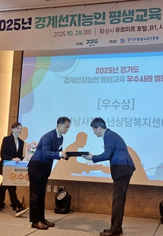 [아이뉴스24 정재수 기자] 성남시청소년청년재단는 성남시청소년상담복지센터 ‘느린학습자(경계선지능인) 찾아가는 심리치료 사업’이 ‘2025년 경계선지능인 평생교육 우수사례 공모전’에서 우수사례 프로그램으로 선정돼 경기도지사상을 수상했다고 29일 밝혔다.