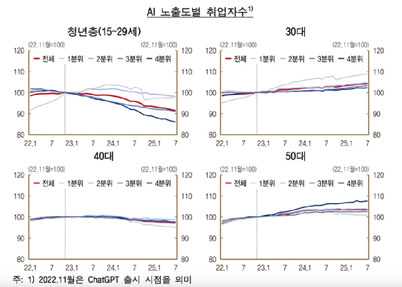 한은은 "AI 활용 역량 강화를 위한 교육 프로그램 확대, 공공 데이터 접근성 제고, 포용적 창업 생태계 조성을 통해 청년층이 AI 확산기에 더 능동적으로 적응하고 새로운 산업 기회를 모색하도록 지원할 필요가 있다"고 제언했다.