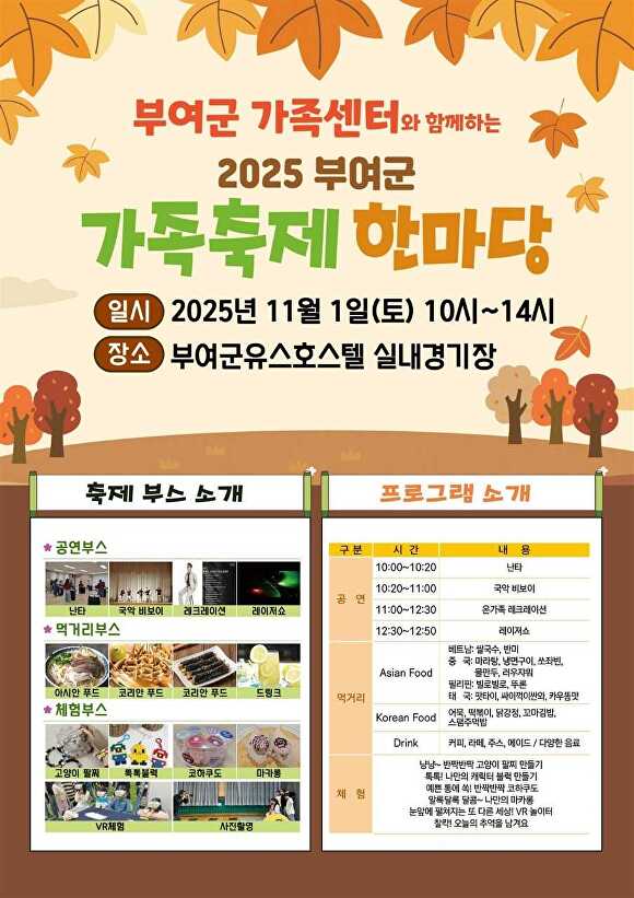 [아이뉴스24 정다운 기자] 충남 부여군가족센터는 오는 11월 1일 부여군유스호스텔 실내경기장에서 ‘2025 부여군 가족축제 한마당’을 연다고 밝혔다.
