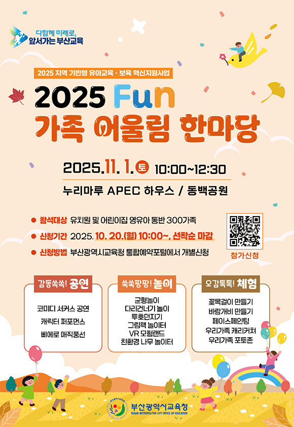 [아이뉴스24 박채오 기자] 부산시교육청은 내달 1일 오전 10시 동백공원과 누리마루 APEC 하우스에서 '2025 Fun 가족 어울림 한마당'행사를 개최한다고 30일 밝혔다.