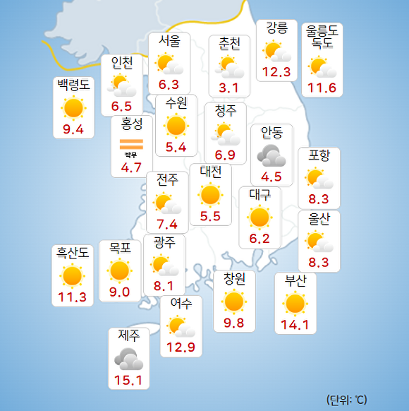 부산지방기상청에 따르면 이날 오전 9시 현재 주요 지역의 기온은 부산 14.1도, 울산 8.3도, 창원 9.8도로 기록됐다.
