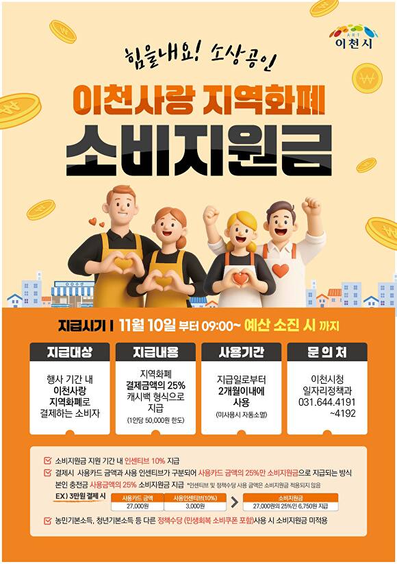 [아이뉴스24 임정규 기자] 경기도 이천시가 경기 침체로 어려움을 겪는 소상공인을 돕고 지역 내 소비를 촉진하기 위해 대규모 지역화폐 소비지원금 행사를 본격 시행한다.