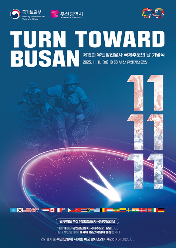 [아이뉴스24 정예진 기자] 부산광역시가 오는 11일 오전 10시50분부터 부산 남구 유엔기념공원에서 ‘턴 투워드 부산, 제19회 유엔참전용사 국제 추모식’을 거행한다.