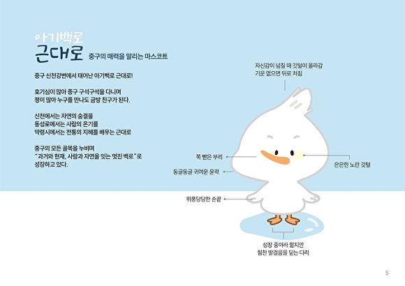 캐릭터는 백로가 서식하는 신천강변의 자연환경, 근대 골목의 역사·문화, 약령시의 전통, 동성로의 활력 등 중구의 주요 상징과 이미지를 아기백로의 형태에 담았다.