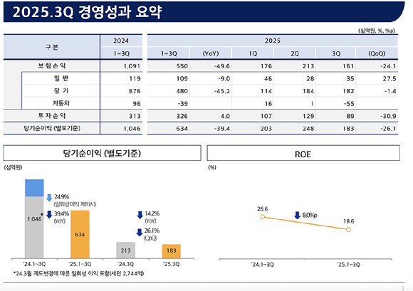 일반보험은 고액사고 발생 둔화와 손해율 안정화 추세를 이어가면서 전년 동기 대비 30.7% 늘어난 352억원을 기록했다. 투자 손익은 일부 자산 평가 손실과 원화 약세로 894억원을 기록했다. 전년 동기 대비 18.1% 감소했다.