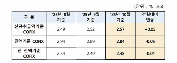 은행연합회는 17일 10월 신규 취급액 기준 코픽스가 전월 대비 0.05%p 오른 2.57%라고 밝혔다. 잔액 기준 코픽스 2.84%로 전월 대비 0.05%p 하락했다.