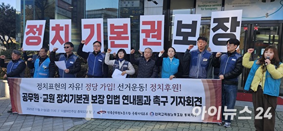 [아이뉴스24 장예린 기자] 전국공무원노동조합 충북본부와 전국교직원노동조합 충북지부 등은 21일 공무원·교원의 정치 기본권 보장 법안의 연내 국회 통과를 촉구했다.