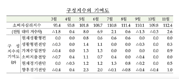 11월 소비자심리지수(CCSI)는 112.4로 전월보다 2.6p 상승했다. 2017년 11월 이후 최고치다. 향후경기전망도 102로 전월보다 8p 높아졌다.