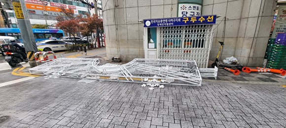 25일 부산소방본부 등에 따르면 이날 낮 12시 50분쯤 사하구 하단동의 한 번화가에서 크리스마스 장식 구조물이 바람에 의해 지상으로 전도됐다.