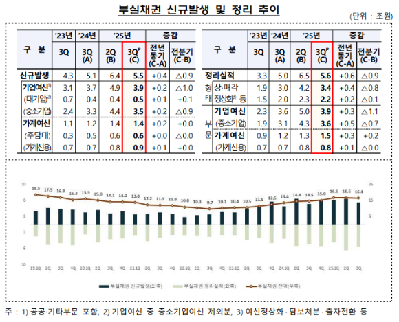 3분기 중 신규 부실채권은 5조 5000억원으로 전 분기보다 9000억원 줄었다. 신규 부실채권 중 기업 여신은 3조 9000억원으로 전 분기보다 1조원 감소했다. 대기업은 5000억원으로 전 분기보다 1000억원 늘었다. 중소기업은 3조 5000억원으로 전 분기보다 9000억원 줄었다. 가계 여신 신규 부실은 1조 4000억원으로 전 분기와 비슷했다.