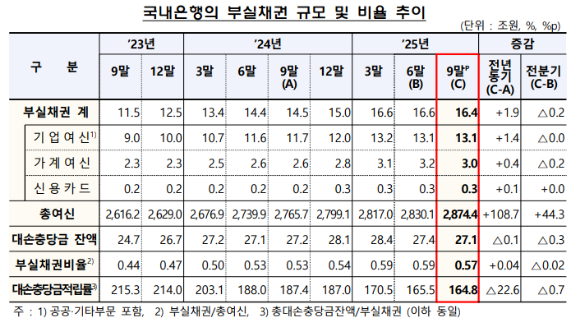 가계 여신 부실채권 비율은 0.30%로 전 분기보다 0.02%p 하락했다. 주택담보대출은 전 분기보다 0.03%p 하락한 0.20%를 기록했다. 기타 신용대출은 전 분기 말보다 0.01%p 상승한 0.62%로 집계됐다.
