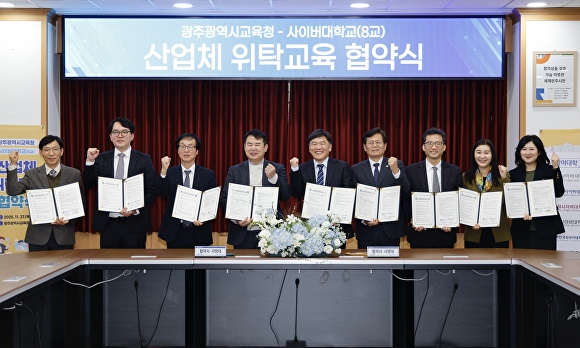 이정선 광주시교육감(왼쪽 4번째)이 국제사이버대 등 8개 대학과 ‘산업체 위탁교육 업무협약’을 체결하고 있다. [사진=광주광역시교육청]