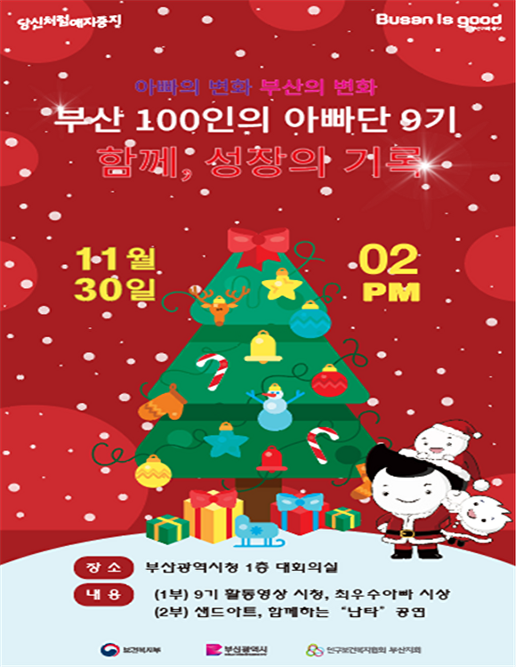 [아이뉴스24 정예진 기자] 부산광역시가 오는 30일 부산광역시청 대회의실에서 ‘부산 100인의 아빠단과 함께, 성장의 기록’ 보고회를 개최한다.