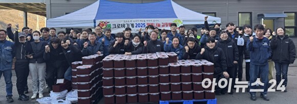 크로바기계 직원들이 28일 배추 1400포기를 김장한 뒤, 기념 촬영을 하고 있다. [사진=크로바기계]
