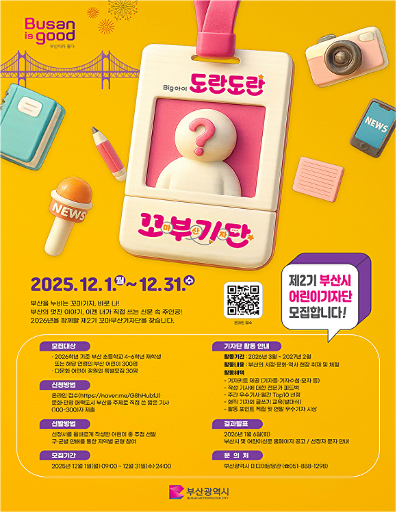 원영일 부산광역시 대변인은 “직접 취재하는 경험이 어린이들에게 성취감과 자부심을 줄 것”이라며 “더 많은 어린이가 부산을 배우고 기록하며 성장하길 기대한다”고 말했다.