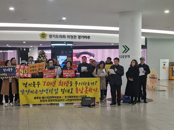경기북부평화시민행동, 동두천시 범시민대책위원회, 의정부시 미군반환공여지 시민참여위원회 등 단체들은 2알 경기도의회 앞에서 '미군기지 반환공여구역 발전기금 300억 전액 삭감 규탄 및 예결특위 전향적 결단 촉구' 기자회견을 열었다.