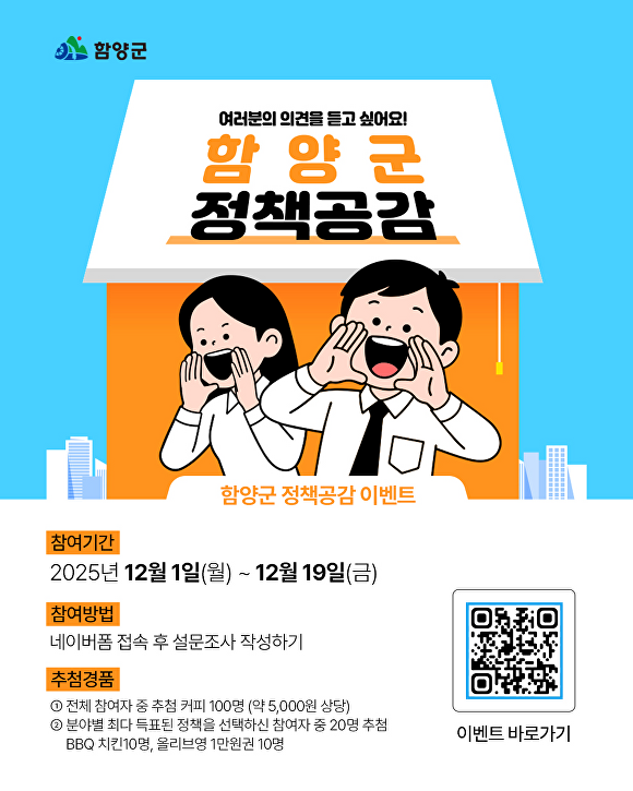 이와 함께 함양군은 소통을 강화하기 위해 군정 전반에 대해 다양한 의견을 듣고 실제로 체감한 정책을 중심으로 ‘함양군 정책 공감 이벤트’를 진행한다.