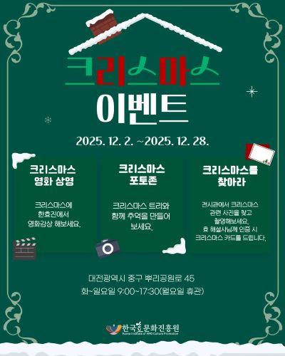[아이뉴스24 강일 기자] 한국효문화진흥원은 연말을 맞아 오는 28일까지 기관 방문객을 대상으로 ‘크리스마스 특별 이벤트’를 진행한다고 밝혔다.