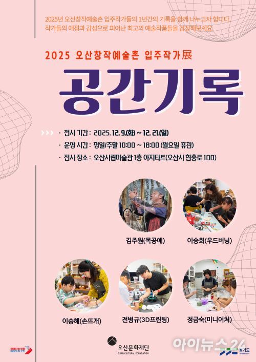 [아이뉴스24 김장중 기자] 경기도 (재)오산문화재단은 오는 9일부터 21일까지 오산시립미술관 1층 아지타트에서 ‘2025 오산창작예술촌 입주작가 전시회’를 개최한다.