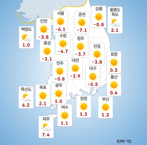 부산지방기상청에 따르면 이날 오전 9시 현재 주요 지역의 기온은 부산 1.3도, 울산 0.4도, 창원 1.3도로 기록됐다.
