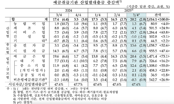5일 한국은행에 따르면 3분기 예금 취급 기관 산업별 대출금 잔액은 2014조 1000억원으로 전 분기보다 20조 2000억원 증가했다. 증가 폭은 14조 5000억원 늘었던 전 분기보다 확대했다.