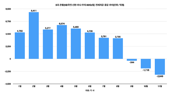 지난 9월(-344억원), 10월(-1718억원)에 이어 3개월 연속 줄었다. 감소 폭은 석 달 연속 확대했다.