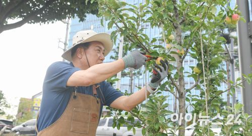 이권재 오산시장이 감사나무에서 사과 첫 수확을 하고 있다. [사진=오산시]